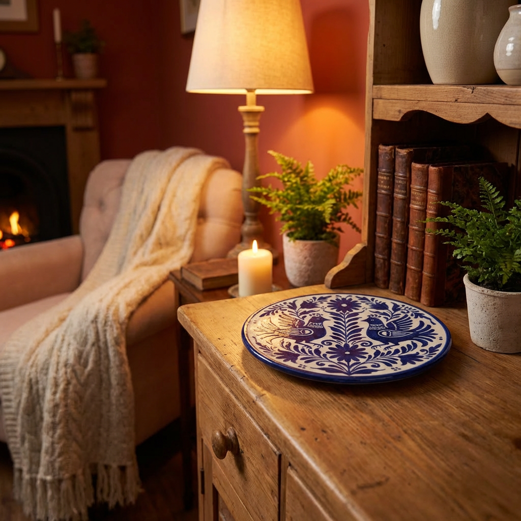 Bring timeless charm to your home with this blue-and-white ceramic coaster featuring a beautifully balanced twin-bird motif surrounded by lush folk-inspired florals. The mirrored design feels calm and intentional—clean enough for modern interiors, yet warm and artisanal in spirit.
